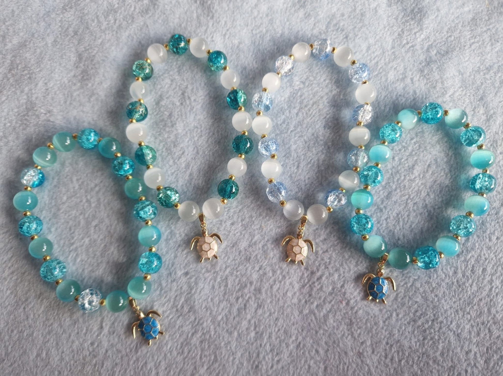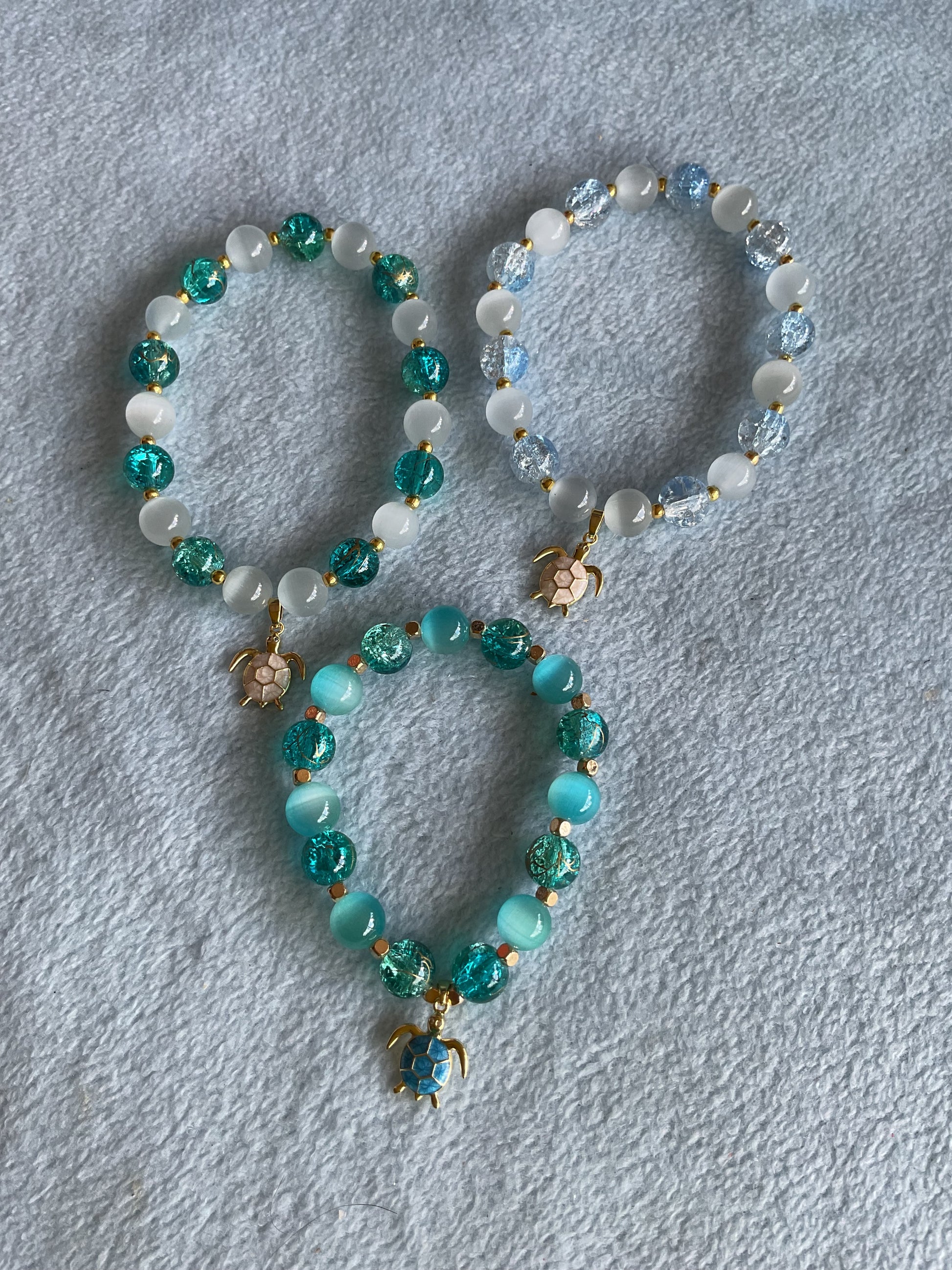 Add a splash of ocean charm to your wrist with this playful bracelet featuring a sea turtle adorned in sparkling micro pave cubic zirconia and vibrant enamel. Crafted with real 18K gold plating, it also showcases a captivating catseye glass bead and crackle glass accents bracelet, making every glance a delightful treasure hunt. Perfect for those who love a touch of whimsy and elegance combined!